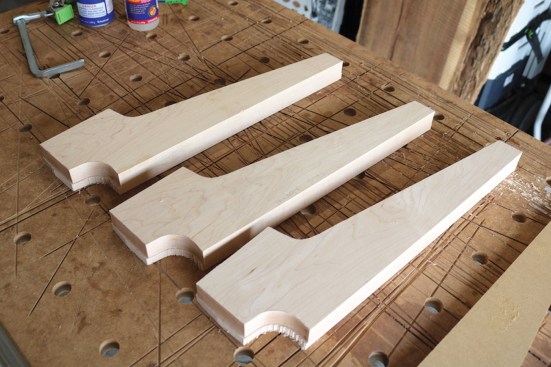 To make duplicate table-top supports, the author first makes a pattern, using it to trace the support’s outline on the workpiece, which he cuts out with a band saw. Then he uses double-sided tape to attach the pattern to the workpiece and finishes cutting it out with a flush trim bit that has a top-mount bearing.
