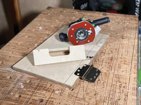 The template is sized to fit the hinge template router bit, which typically has a short cutter-to-bearing distance since most hinges aren’t very deep.