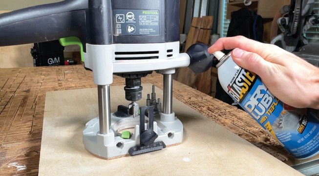 I like to keep my routers running like well-oiled machines, literally. The router has a few moving parts, such as the spindle, and on the larger plunging routers, plunge tubes. A quick spray of white dry lube can keep these parts moving swiftly without sawdust sticking to them like it does to traditional oil lubricants. Any overspray can be easily wiped off with a rag once dry.