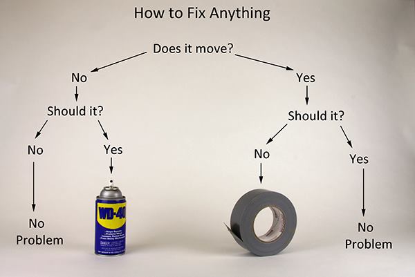 I looked into it and drew a blank – that is, until I found this chart that suggests a relationship between the fortunes of the two products. There’s no evidence that sales of duct tape are down, but if you’re an investor you might want to keep an eye on this. And if you’re not an investor – well, the chart offers excellent advice on how to fix anything.
