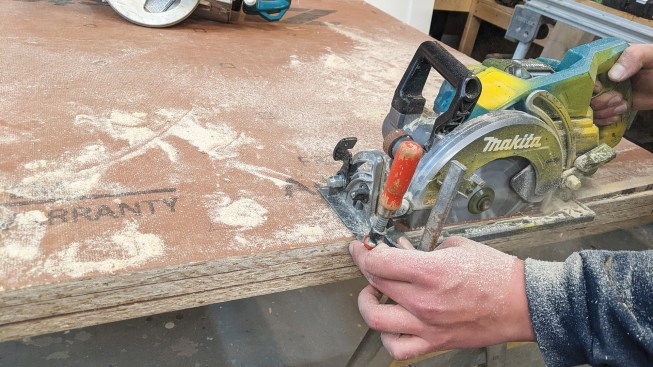 In our second test, we made five full rips through a three-layer stack of 5/8-inch Zip System sheathing, or 40 lineal feet of near-continuous cutting through almost 2 inches of OSB. Presumably because the battery’s indicator lights are not visible, the 36-volt saw has a top-mounted LED battery-level indicator, a great feature that also shows when the motor is working too hard or being over-torqued, alerting the user to slow down. Both saws ripped through the sheathing at similar speeds and nearly drained their batteries by the end of the test.