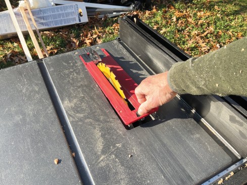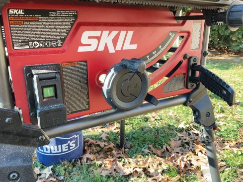 Out of the box. Unlike table saws that ship with stands that require assembly, this one has folding legs that lock and unlock with a push of a bottom. The legs are rock-solid, and the splay keeps the saw stable for ripping long stock. There’s no outfeed support, but that’s not an issue for me since most supports I’ve seen don’t work very well anyway. The saw is very light (Skil says it weighs 51.2 pounds) and has nice, overmold grips to carry it like a tray. On its right side is a handle for carrying it like a satchel; I use that to tie the saw to a bar in my truck so I can store it vertically and free up floor space.