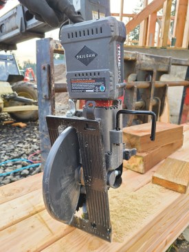 The beam saw also features a rafter hook, which the author found works fine on rafters, but not so much on sawhorses.