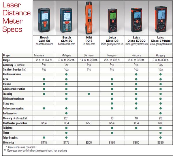 Tracking, min/max, stake-out. All of these tools can take a cont… Tracking, min/max, stake-out. All of these tools can take a continuous reading while moving toward or away from a target, which is called “tracking.” Eight tools can also freeze the minimum and maximum distance measured, which makes the function far more useful. For instance, you can check a room or door jamb for square by sticking the laser’s tailpiece into a corner, sweeping the beam across the opposite corner, reading the maximum length, then repeating for the other diagonal. Tracking the minimum reading between two surfaces is also useful — for fitting built-ins between two out-of-plumb walls, for example. (For some reason, the new Stanley TLM 165 min/max mode only works with indirect measuring, not tracking.) Seven models offer a “stake-out” mode, used for laying out a series of equal intervals by setting the spacing dimension and moving the laser away from a fixed target. A change in tone pitch or frequency indicates when each interval has been reached. It’s reasonably accurate but slower than using a tape.