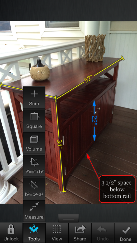 A smartphone is one of the most useful tools in a contractor’s arsenal—for communicating, ordering or researching products, and for the apps that can be used with it. My Measures & Dimensions Pro is an amazing app that allows you to photograph a cabinet, room, or some other object and put notes and dimensions on it. It’s faster and more accurate than creating a dimensioned drawing and the photo is on your phone where it can be emailed, printed, saved to a job folder, or retained on the camera roll. The app can be used to measure angles and to add calculate dimensions.