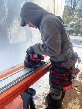 Performance. Cutting with the Milwaukee M18 track saw, as with most of the track saws on the market, is a joy. The brushless motor on the saw has plenty of power cutting and ripping all framing materials and doing light surgical demo work—one of our carpenters used the saw to make a straight line cut in a roof deck that allowed us to tie a new addition roof in while giving the roofer a clean line to patch to. Using a wheel-style speed selector, the brushless motor can be set to produce 2,500 to 5,800 rpm with a max of 6,300 rpm under load. The saw has shown it has plenty of power for all the framing applications that we’ve put it through and plenty of finesse for the standard track-saw application of cutting finish-grade sheet goods and trimming interior doors.