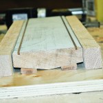 Profiled handrail stock is a little more complicated. Because the joining pieces are lapped on opposite sides, one of the cuts will have to be made with the profiled side down. I make one jig to hold the stock, which I stabilize with wedges to prevent it from rocking (Figure 19). A second jig — simply two straight pieces screwed to a plywood base — guides the router (Figure 20). The edge of the router bears on the straight pieces, which are set apart twice the distance that’s between the bit and the edge of the router base, plus the width of the lap.