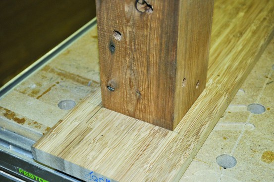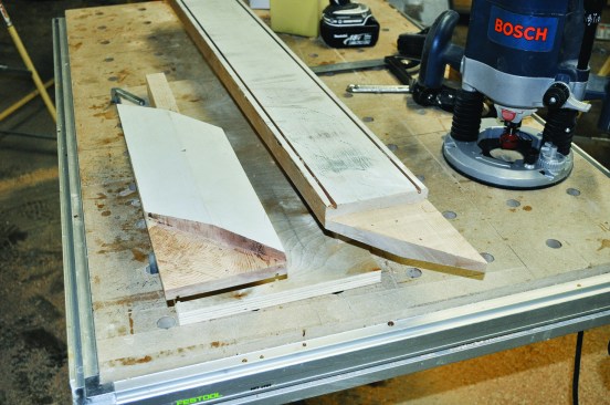 Make a couple of passes with the router until the lap joint is cut (Figure 16). Trim the stock to length (and the correct angle) using a circular saw guided by the straightedge (Figure 17). Glue and clamp the pieces together (Figure 18); when the glue has cured, lay out and cut the curves.