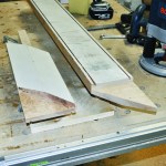 Start by setting the router at half the depth of the material (Figure 15). The bit I used was a 3⁄4-inch straight cutter. Lay out the miter angle on the stock. Clamp a straightedge to the stock at that angle; the distance between the straightedge and the desired line of cut should be the same as the distance between the bit and edge of the router base.