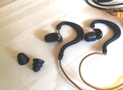 The rubber hooks that are meant to wrap around the ear are cut down the middle so they can be taken off or replaced should they get damaged. They also can be moved up and down the braided nylon cord so you can wrap them tightly around your ear. At first the rubber hooks were annoying because they kept flopping round and didn’t seem to stay put. But I later discovered that they tuck behind the crease of the ear and hook over the front of it. If you do that correctly—it takes a few tries—they will stay put and you’ll barely notice they are on.