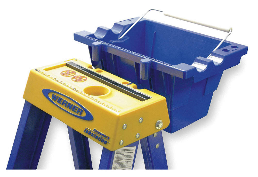 JobBucket hooks onto the bosses in a stepladder (if it has them; certainly Werner designed it for its ladders). This is great if you repurpose it for electrical or you’re running plumbing overhead.