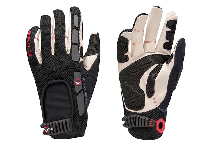The MasterSmith design (above) features multiple areas of reinforced padding and added leather patches. The back has a breathable two-way stretch spandex area, which provides a “snap back” effect after you put it on, and ultimately allows the glove to hold up better in day-to-day wear. The shell comprises 22 separate pieces so the leather conforms to the hand and won’t bunch up at the palm. A hex nut grommet and enhanced strap help ensure a secure fit.