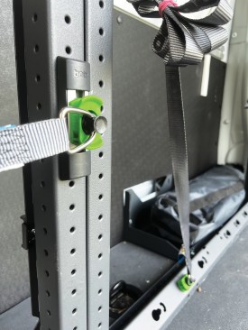 Security. bott Smartvan is one of only two companies worldwide to receive an ECE R17 crash test safety rating. This standard, which simulates a collision of an obstacle with a fully-loaded vehicle at 32 mph, focuses on fixing points, flooring, sidewalls, and overall construction of the shelving system. The bott Smartvan system is designed to keep tool cases and storage boxes firmly in place. The frames have integrated lashing rails that work specifically with optional bott Smartvan lashing straps and anti-slip mats to help prevent loads from sliding around. Lashing brackets that attach to the frame with T25 Torx bits are also available, allowing loads to be secured in any position.