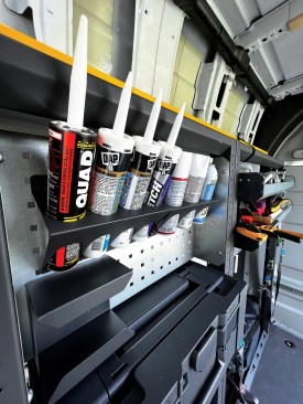 The shelving can be configured for the way you work, with accessories such as spray-can and caulking-tube holders.