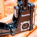 This new Makita radio is an upgraded version of a radio we reviewed in 2011. It’s relatively compact but is taller and boxier than other jobsite radios and has speakers that face to the sides. The LXRM03 can be powered by an included AC adaptor or 9.6-volt to 18-volt slide-style and pod-style Makita batteries. The batteries and adaptor store in a gasketed compartment on the back of the unit.