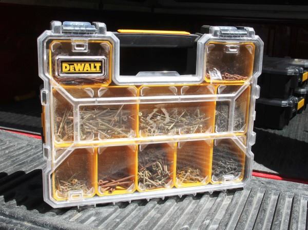 A little over a year ago I noticed a DeWalt storage product I hadn’t seen before, the Deep Pro Organizer (DWST14825) a modular plastic box that contains removable plastic cups for storing small parts and fasteners. The price was right so I bought three. A few weeks back I saw a new smaller version of the organizer (DWST14740), the Mid-Size Pro. I liked the large organizers so I immediately bought two of the smaller ones.