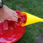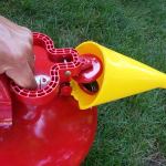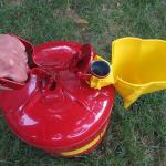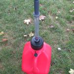 This galvanized steel gas can has a steel fill handle with a separate funnel. Once attached, the funnel is tipped down to fill and clicked back up into position to dispense. I assumed it would operate similarly to the Eagle Safety Can, but the funnel design is terrible to the point of being dangerous; I spilled so much gas on myself while fueling a vehicle that I stopped the test midway through and won’t use the can again. The exit point of the funnel’s nozzle is about the diameter of a dime while the funnel is huge. The user must take extreme caution not to tilt the can too much, which overfills the funnel, causing it to back up and leak at the connecting joints while dispensing. Granted, if you pour the gas out like a little old lady, I’m sure the system works adequately, but time is money and my goal was to find gas cans that dispensed quickly without spilling.