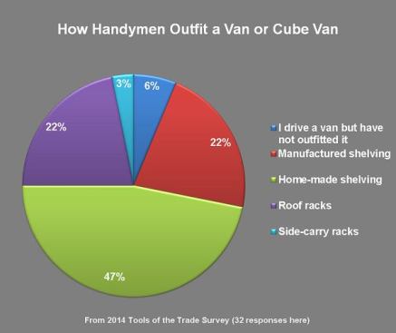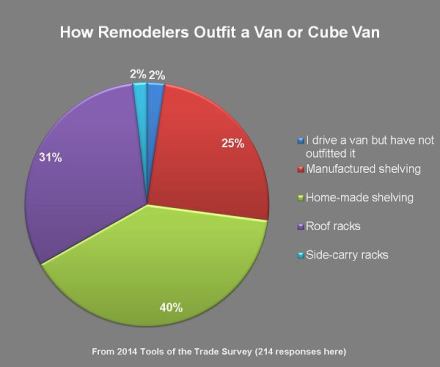 Earlier this year we conducted a survey and one of the questions was “How have you outfitted your van for hauling tools and materials?” The answers were multiple-choice and it was possible to choose more than one because tradesmen often install more than one accessory in their vans. Choices included: