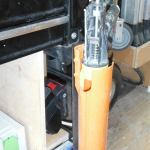 The cart stores in the back of my box truck. To keep cart from r… The cart stores in the back of my box truck. To keep cart from rolling around, I had custom brackets made that use long slide bolts to hold it against a built-in cabinet. When the cart is mounted it is plugged into the truck’s inverter so the batteries on it charge on the way to and from the jobsite.