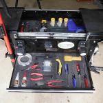 I outfitted the drawers with Kaizen foam (a type of shadow board… I outfitted the drawers with Kaizen foam (a type of shadow board material from FastCap) so each tool fits into a recessed spot all its own. This makes it easier to find tools and I immediately know when one is missing – which is not the case with a tool bag.