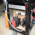 I further customized the cart by installing vertical dividers in… I further customized the cart by installing vertical dividers in the lower shelf and attaching a charging station to the side of one. Here you can see the chargers for 18- and 12-volt batteries. This location also contains a phone charger. The cart contains a power strip that can be plugged in on site or in the back of the truck.