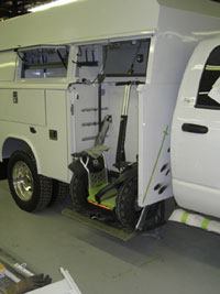 Plymouth, MI.– Well the master craftsmen at Special Projects shop in Plymouth, MI have made their first custom cuts into the Site Commander and its Reading body – building the electric lift compartment for the all-terrain Segway X2 Adventure. It’s sort of a superintendent’s personal Site Commander right down to the Dell XFR Latitude laptop that rides on the Segway.