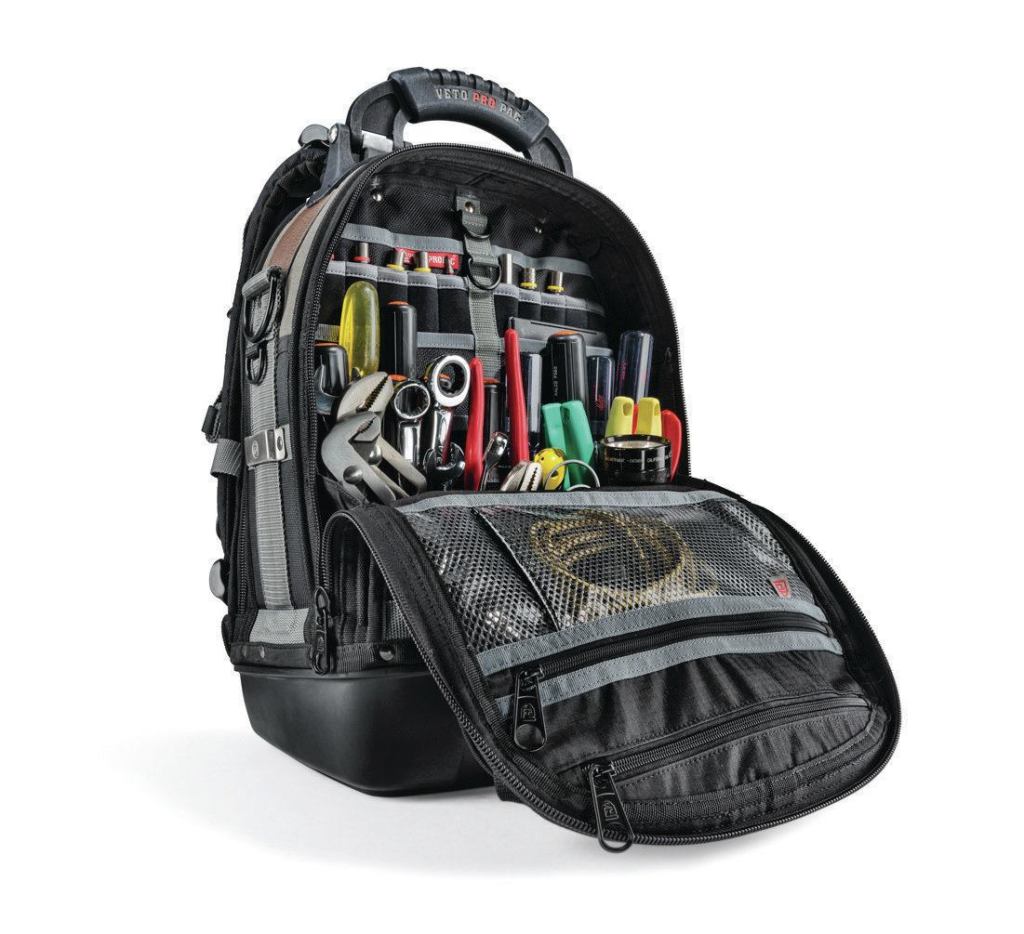 Veto Pro Pac’s new Tech Pac allows you to haul tools and keep your hands free for climbing ladders or carrying other items. The backpack has large zippered openings in the front and back, nine D-rings of varying sizes, an 8-inch fabric loop to hold tapes, and most important, more than 50 vertical tool pockets—interior and exterior. Made of denier nylon, the pack comes with a waterproof base, as well as an aluminum hook so you can easily hang it. For comfort, the shoulder straps are padded and the back has a layer of EVA foam padding. There is even a zippered pouch for a tablet. Price: $230. COO: China. 877.847.1443. vetopropac.com.