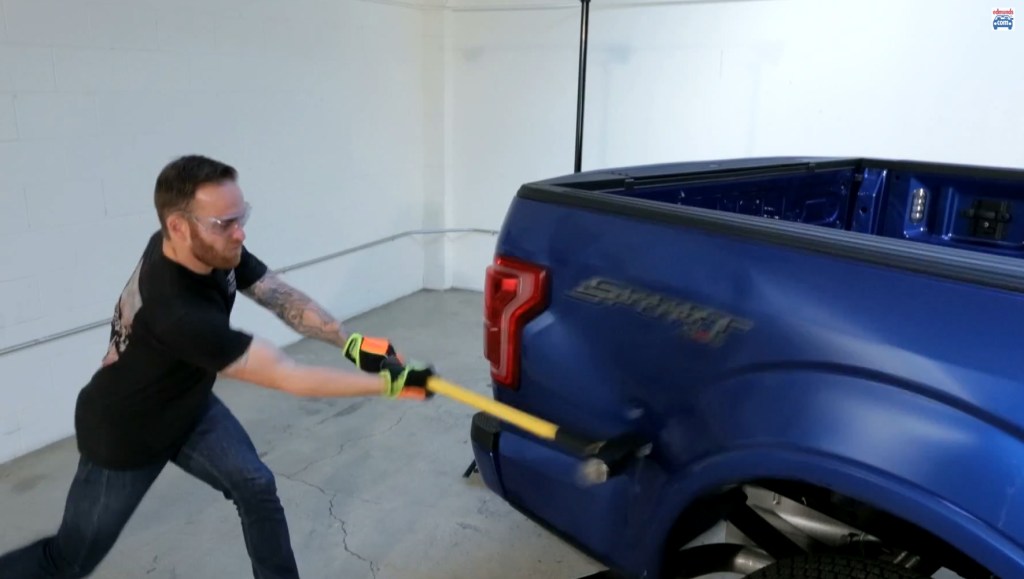But beyond better gas mileage and greater load capacity because you’re hauling “less” truck, what else do you get by going to an aluminum body? Many believe the change will result in higher prices for repairs because aluminum costs more than steel and is a more difficult material to work with. Edmunds decided to test this hypothesis by taking an 8-pound sledge hammer to the right rear quarter panel of a 2015 F-150 (video below—watch it and cringe). After hitting the truck twice they took it to the local Ford dealer and had it repaired.