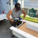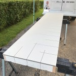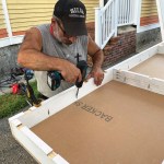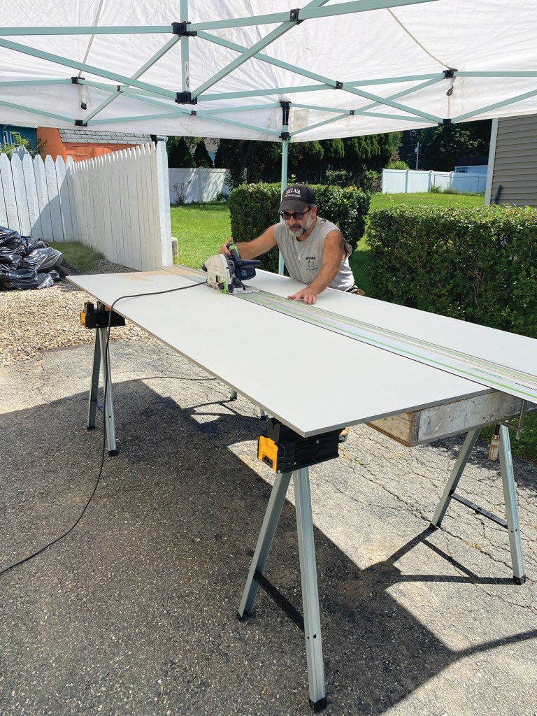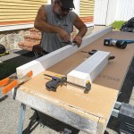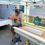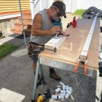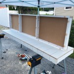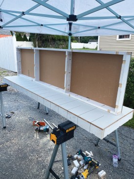 You can make the frames out of whatever material you have on hand, but I like to use primed 5/4×4 stock, cutting all of the pieces for both tables to length at the same time (click on the slide show to see the process). After assembling the frames, I cut sheet goods to size and fasten the tops to the frames. Again, if you have a full sheet of plywood on hand or some plywood rippings, you can use those; for the worktables shown here, I ripped a full sheet of 1/2-inch MDO in half, making it possible to assemble two 24-inch-wide tables at the same time. MDO is more expensive than standard plywood, but it’s rugged and stands up well to weather. I usually cut a few inches off the ends of the ripped panels to make the tables a little shorter than 8 feet so that they will fit more easily in the back of my box truck.