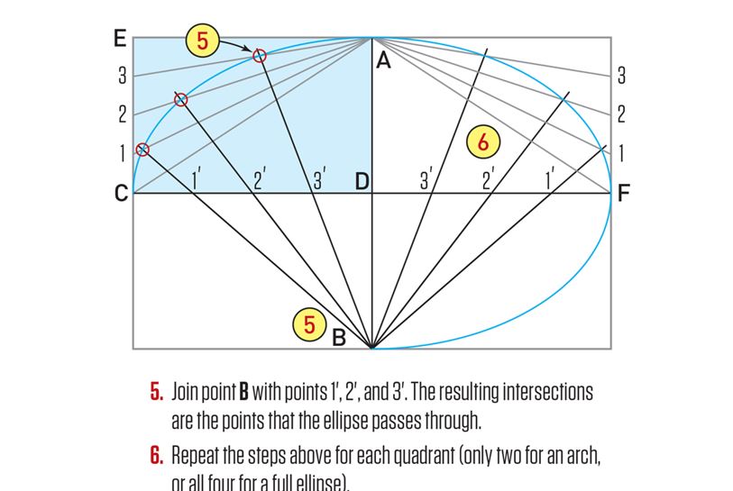 We can build on the use of a scale to divide the baselines (AD and DB) of two equilateral triangles (ADC and DCB). By snapping chalk lines between 1 and 1', 2 and 2', 3 and 3', etc., we can define the arc of a circle for a regular arch. As indicated, the more segments you define, the smoother the curve will be.