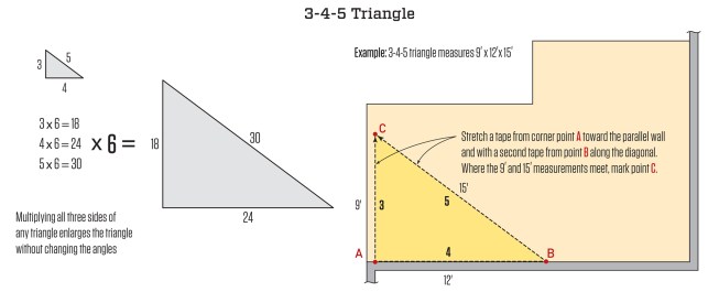The example shown above is a 6-8-10 right triangle—a larger form of the all-powerful 3-4-5 right triangle; if one leg of a triangle measures 3 and the other 4, we know by the Pythagorean theorem, c = √ (a2 + b2), that the diagonal measurement, c, will be 5. But we don’t have to calculate this. Rather, we can use these dimensions as a check for square for any right angle: By measuring out one side equal to 3 units (inches, feet, anything) and the other side equal to 4 units, we know the hypotenuse connecting these sides will equal 5 units—or any multiple of 3-4-5: 6-8-10, 9-12-15, 12-16-20, and so on. When you’re squaring a floor or a foundation (see example, below), it’s always most accurate to use the largest multiple for the walls that you are laying out. For a more detailed explanation of this layout procedure, see “Framing Square Basics: Foundation Layout.“