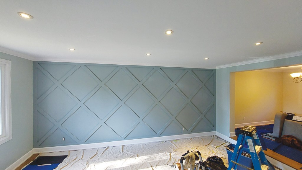 I made the example shown here using 1×4 flat MDF stock to create a straightforward lattice pattern on a wall that does not have many features (switches, outlets, art, wall sconces, etc.) to work around or emphasize. The design is based on a picture that my boss of 24 years had seen on Pinterest and requested be roughly duplicated in her living room. Since she was unable to find a cheaper contractor than her husband, I got the job.