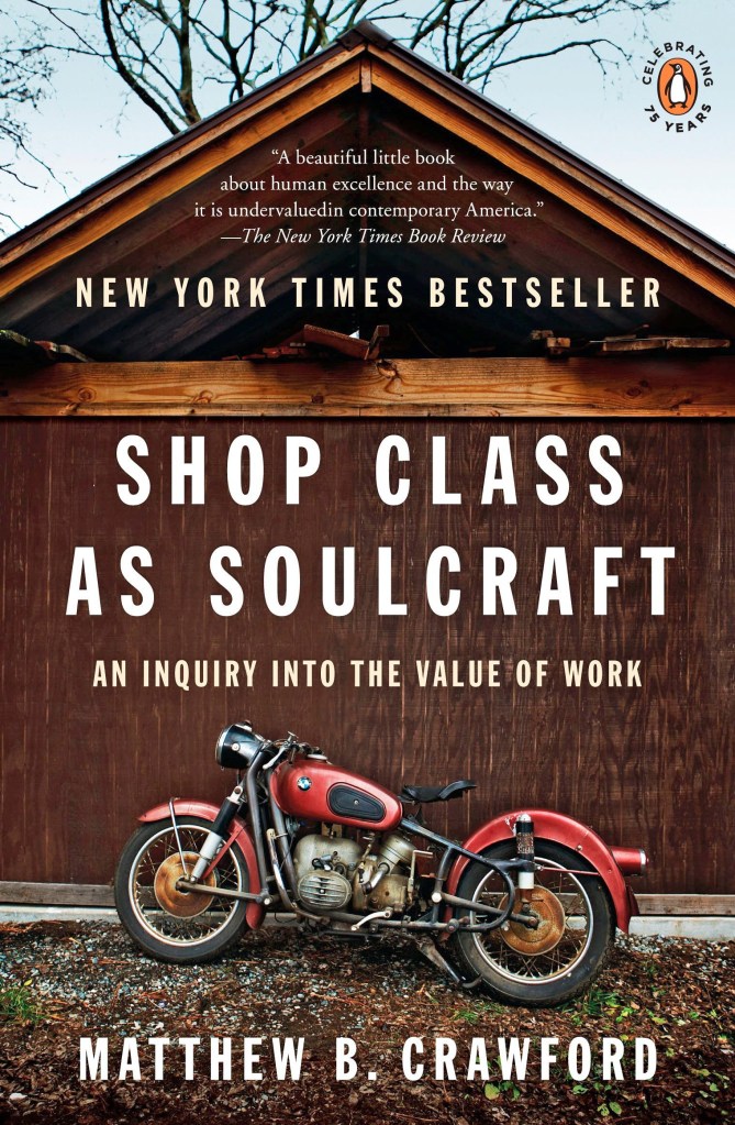 I am late to the party reviewing Shop Class as Soulcraft: An Inquiry into the Value of Work, by Matthew Crawford. The book came out in 2009 and created quite a splash then. You can find many reviews online, most of them positive and well-deserved, and Crawford made the rounds on many a talk show (including an appearance on “The Colbert Report”), delivering his message on the value of hands-on work. Crawford’s specific trade is the rebuilding and repair of old motorcycles. He is a gearhead at heart, but his exposition deliberately celebrates all trades in which knowing comes from doing. “My purpose in this book,” Crawford writes, “is to elaborate the potential for human flourishing in the manual trades …”